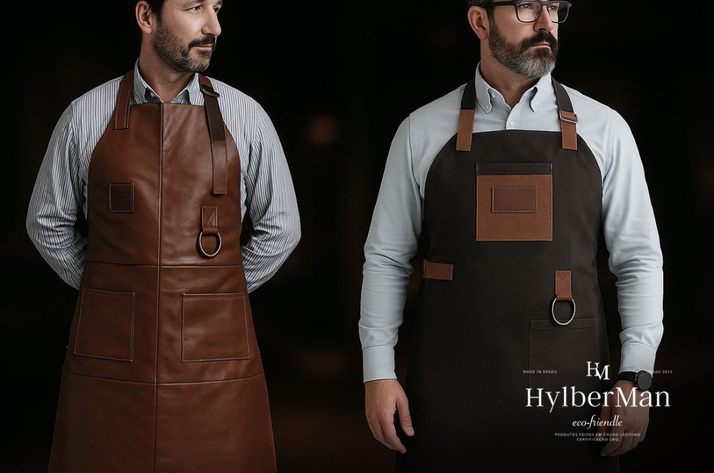 O avental de cozinheiro costuma ser mais leve e voltado para o ambiente interno: fogão, forno, bancadas. Ele prioriza conforto, mobilidade e facilidade de limpeza. Já o avental de churrasqueiro precisa encarar gordura quente, fumaça e calor direto da brasa, exigindo materiais mais robustos, como lona reforçada ou couro legítimo.